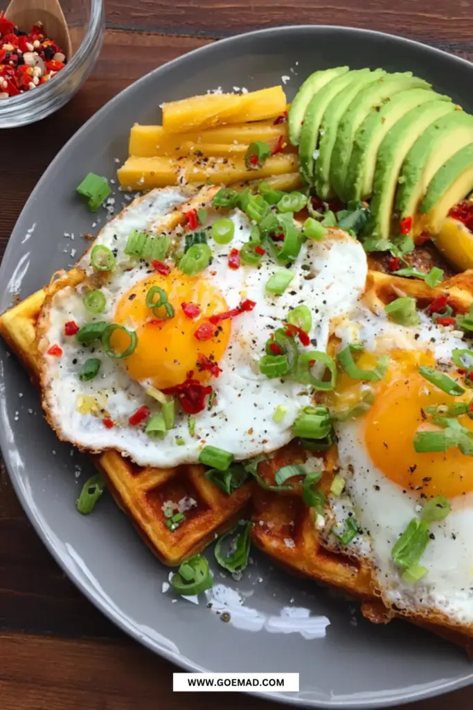 - Anret tallerkenen: Placer vaflerne som base, læg spejlæg, avokado og ost ovenpå og afslut med forårsløg og chili.