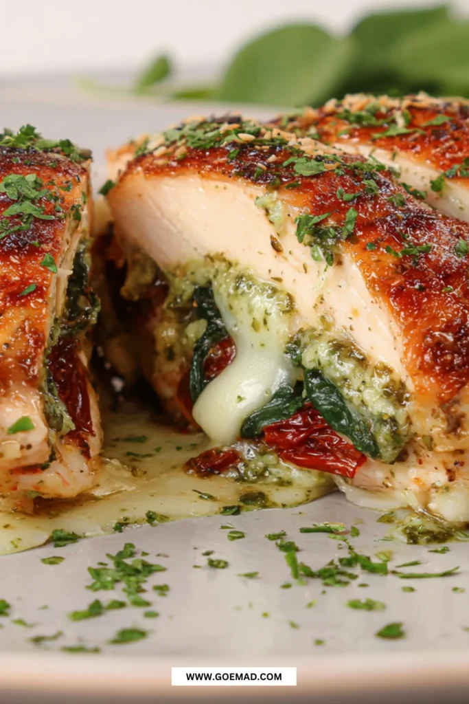 Fyldt kyllingebryst med pesto, soltørrede tomater og mozzarella