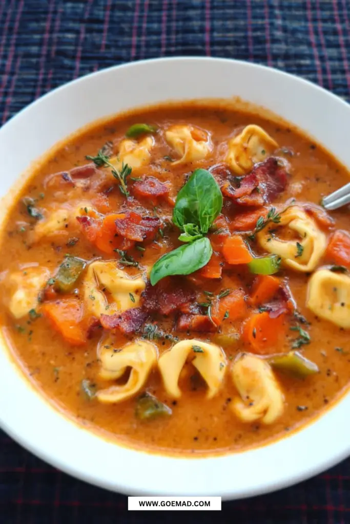 Det er kombinationen af baconens salte dybde og flødens bløde syre fra tomaterne, der gør denne suppe så balanceret. Jeg bruger altid frisk tortellini når jeg kan finde det.