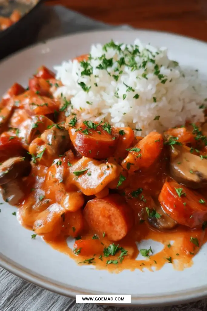 8. Saml retten: Når saucen er tyknet, tilsættes svampe, pølser, løg og bacon. Smag til med salt og peber.