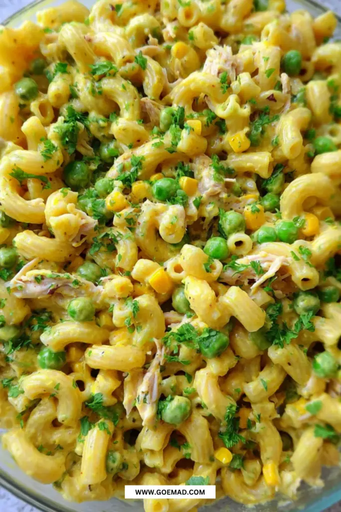 - Saml salaten: Kom pasta, bacon, kylling, ærter, majs og finthakket rødløg i en stor skål.