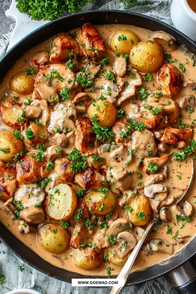 Ovnbagte kartofler med kylling: nem hverdagsaftensmad med cremet champignonsauce